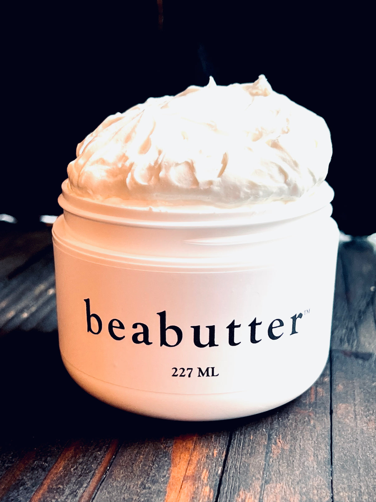 beabutter is a topical shea butter cream blended with; jojoba, apricot kernel, rosehip, grape seed, avocado, almond & vanilla, lavender & chamomile as its essential oils.
